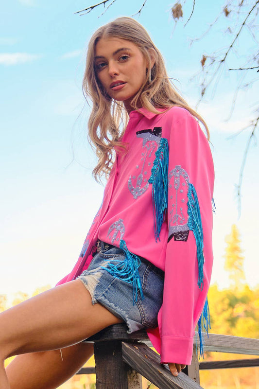 Western Cowboy Boots & Fringe Shirt - Hot Pink