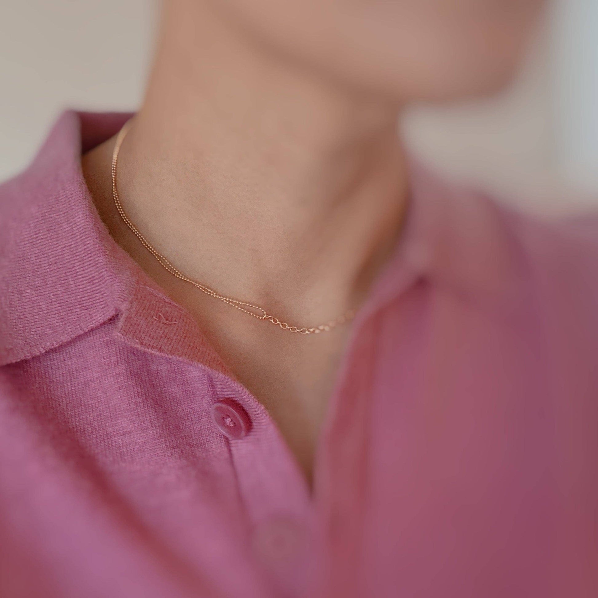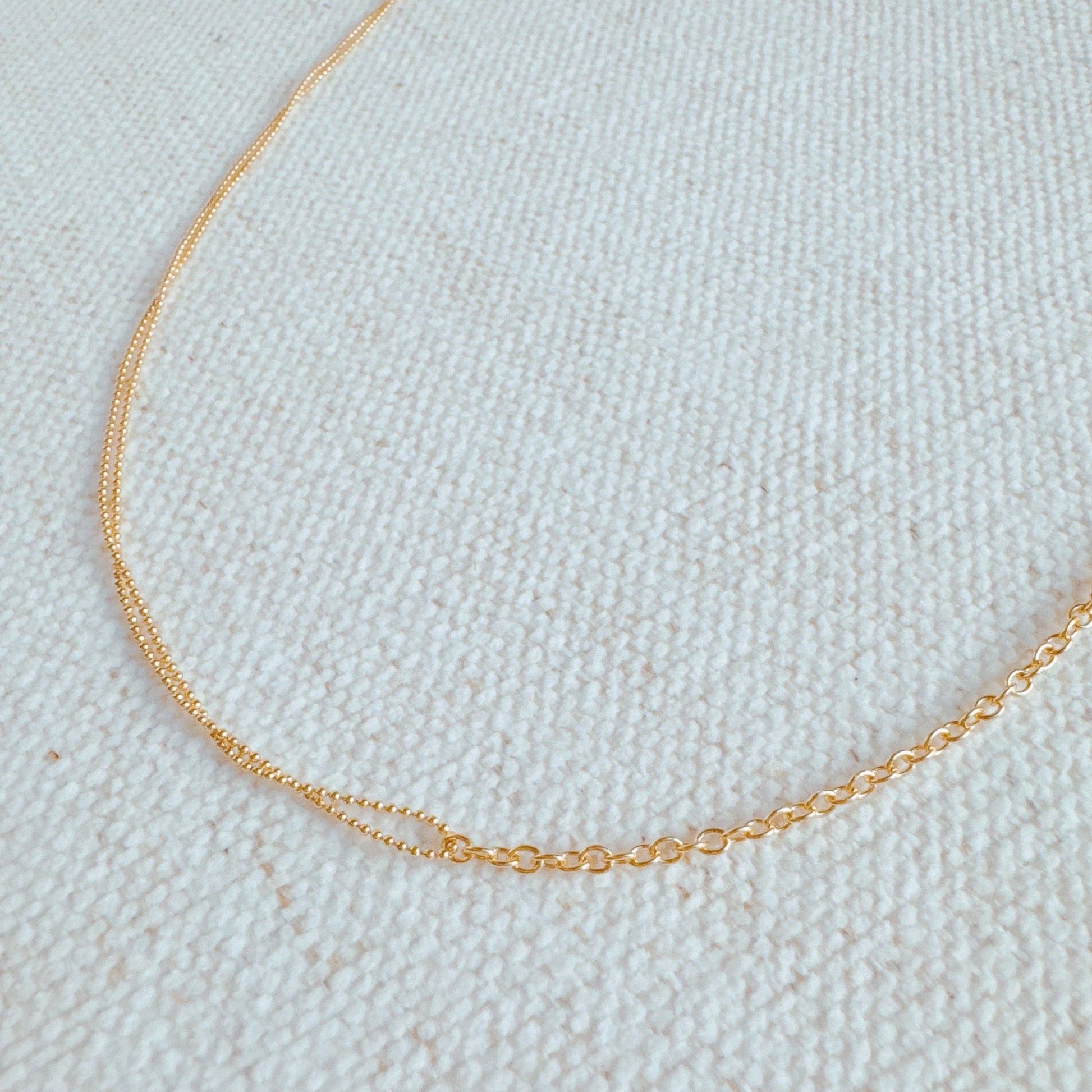 The necklace features a modern and chic chain design, with two styles meeting as one. It is perfect for layering with other pieces for a stylish and versatile look. Add a touch of sophistication to any outfit with this must-have accessory.