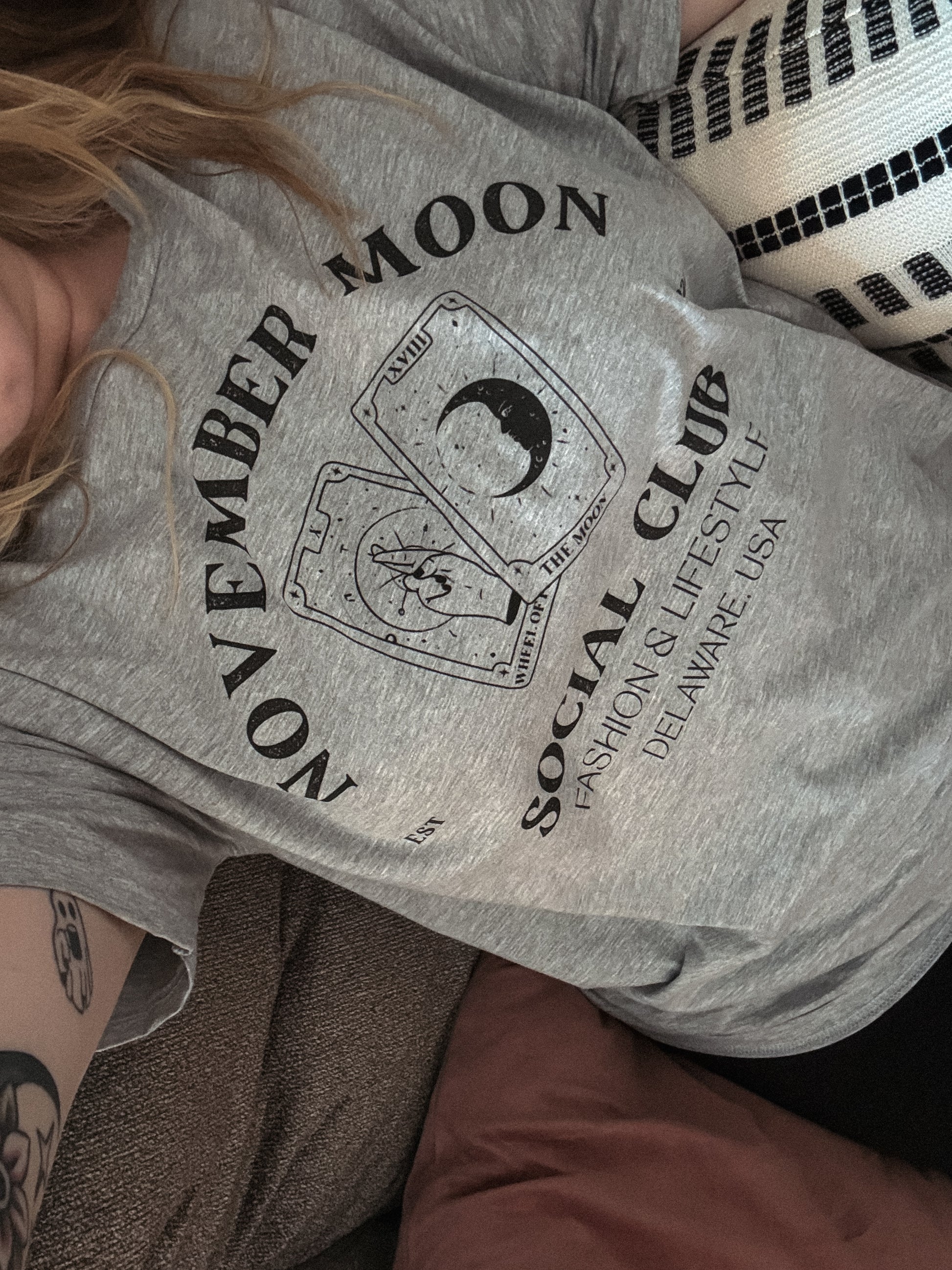 MOON TRIBE - Listen up! This shirt is for you! You voted and we made it... a November Moon Social Club Tee. Chic, effortless style with the comfort of a t-shirt. The heather gray, short-sleeve tee makes it a versatile unisex wear